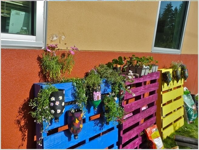 Bản thân kẽ hở giữa các thanh gỗ trong pallet cũng hoàn toàn lý tưởng để bạn treo lên đó những chậu cây, chậu hoa. Bạn thấy đấy, như trong bức tranh này thì chỉ vài tấm pallet gỗ, ít chai nhựa và chút khéo tay là bạn đã có ngay một khu vườn treo đẹp mắt.